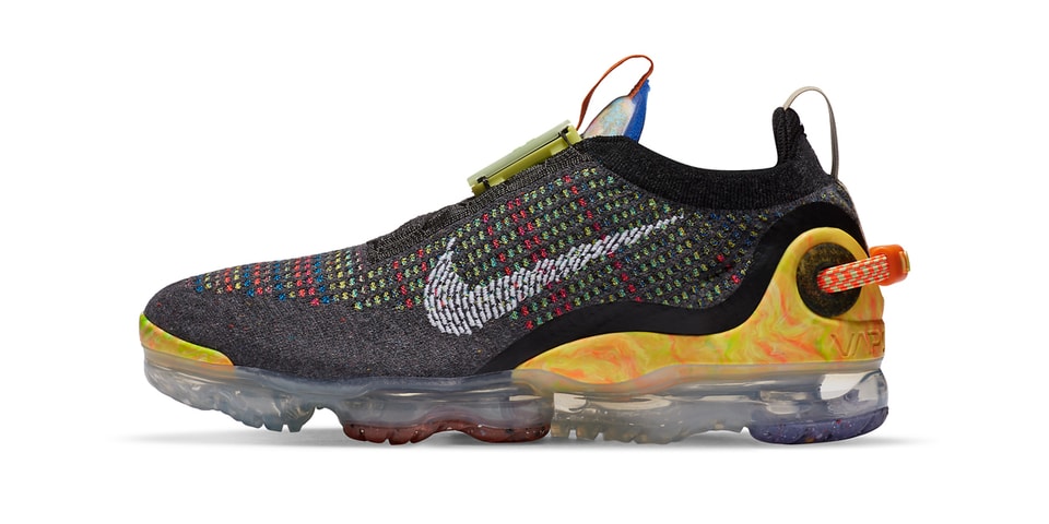 The “mild” half of that dual-sided equation is handled by the upper’s dark grey Flyknit base and white Swooshes plus the midsole’s crystal clear VaporMax cushioning unit. The rest of the shoe’s pieces make up the “wild” half, weaving multi-colored threads across toeboxes and quarters, proffering printed details on the tongue, adding marbled yellows and oranges to the heel and toe and using recycled rubber for color on the outsole. Orange insoles with a Nike Sportswear-style sunburst graphic add a hidden pop of flair.