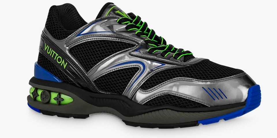 The shoe features large panels of mesh-nylon for breathability and joins them with metallic leather. Each sneaker is accented with hits of vibrant colors like red, yellow, lime-green, and blue. Logos can be found at the heel counter in the form of “VUITTON” printing, an LV logo at the tongue, and textured Monogram flowers at the outsole.